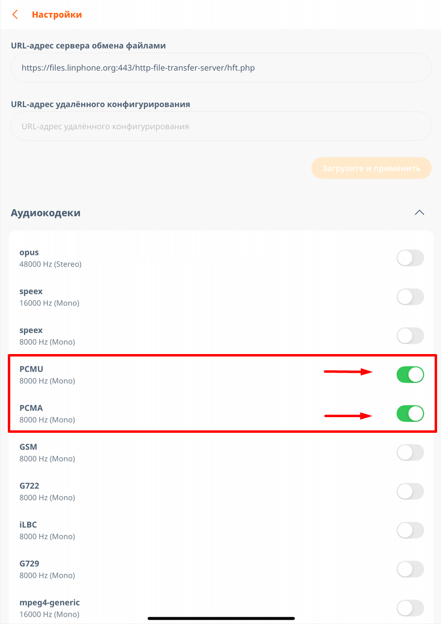 13.Оставьте включенными два пункта кодеков: PCMU и PCMA