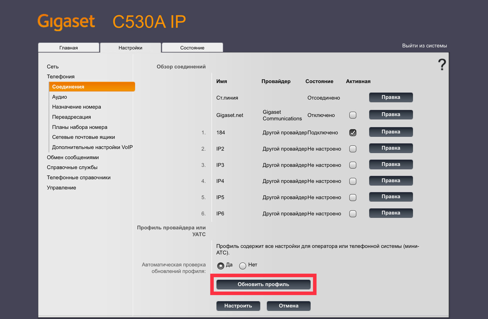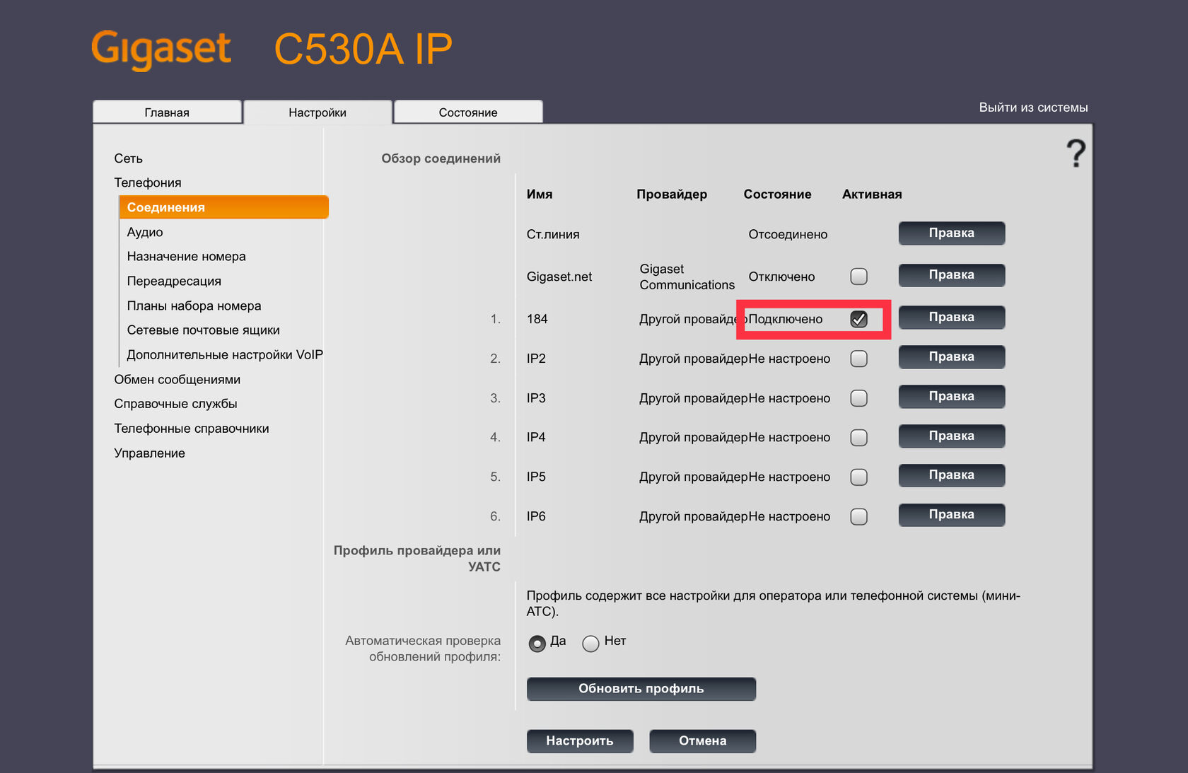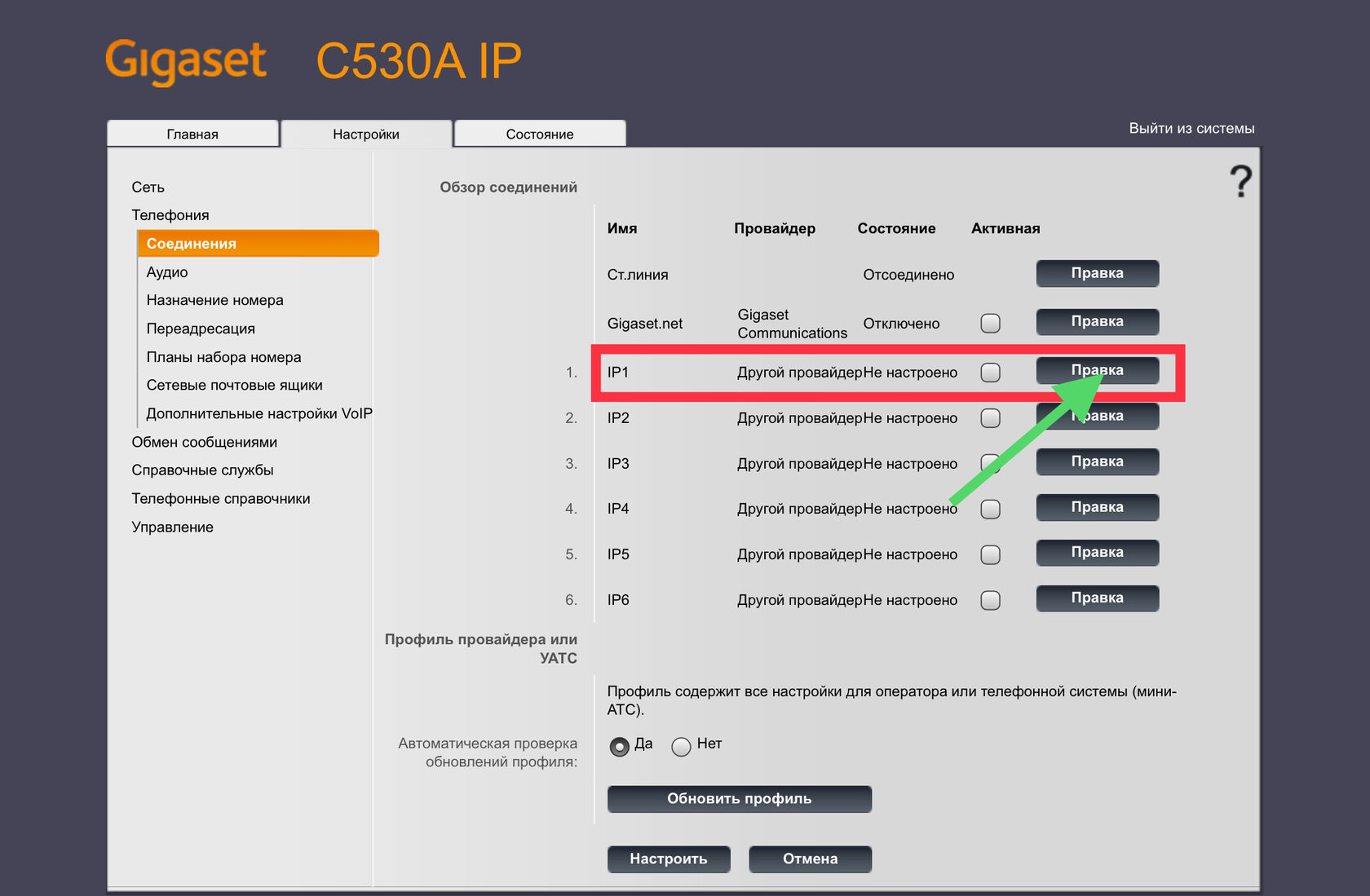 Открываем вкладку «Настройки» и слева выбираем пункт «Телефония» - «Соединения» . Выбираем линию, нажимаем “правка”.