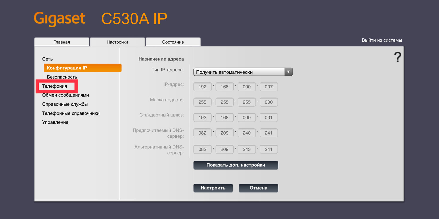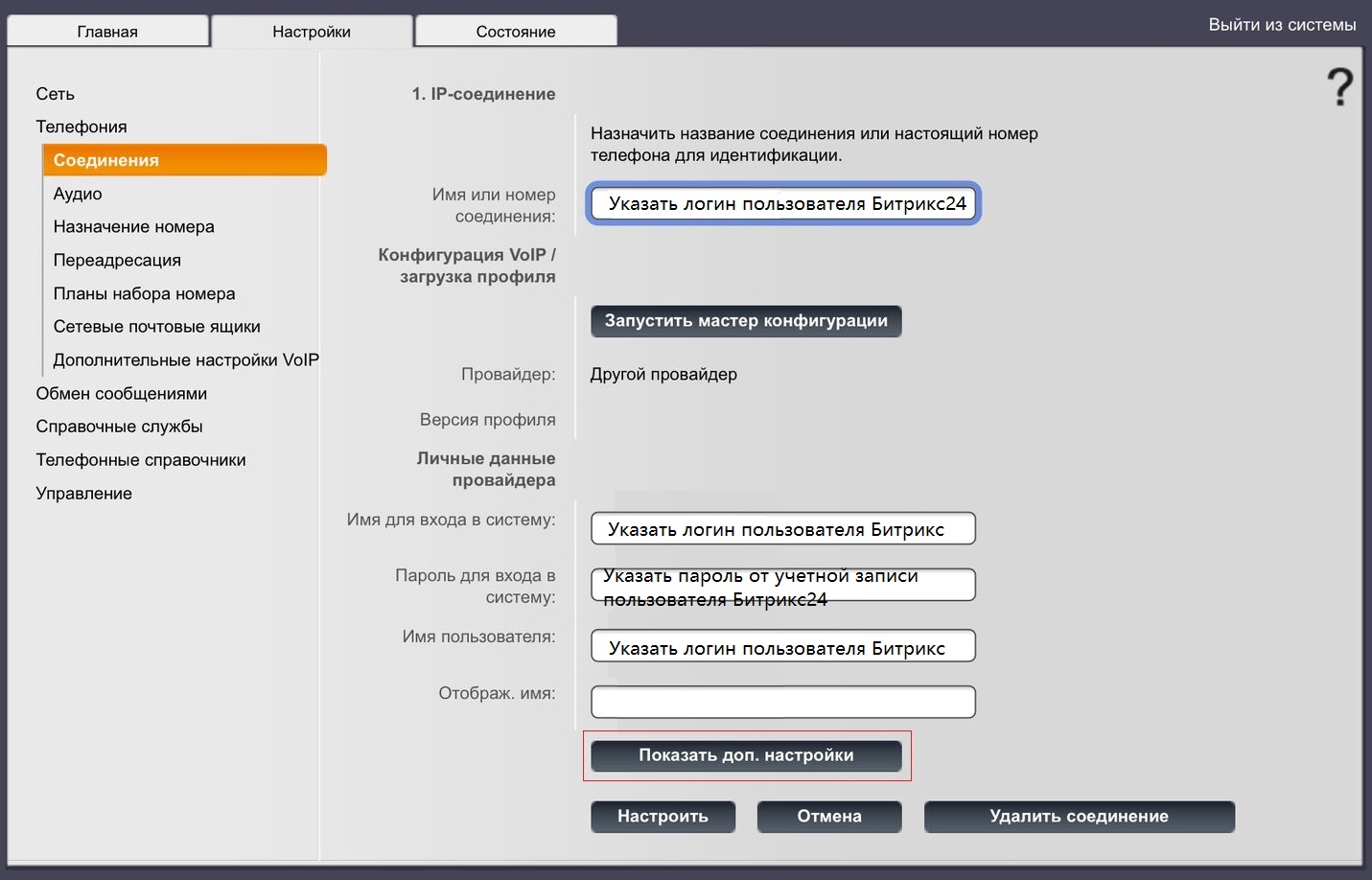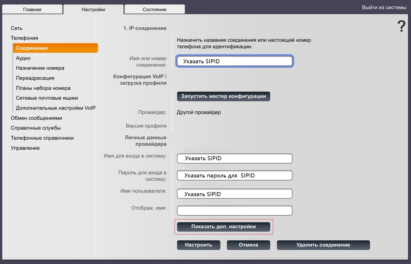 Открываем вкладку «Настройки» и слева выбираем пункт «Телефония» - «Соединения» . Выбираем линию, нажимаем “правка”.