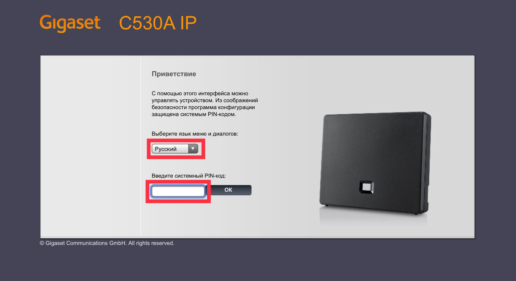 Вводим его в браузере на компьютере и попадаем на страницу авторизации. Выбираем нужный язык и вводим Pin-код. умолчанию PIN-код – 0000