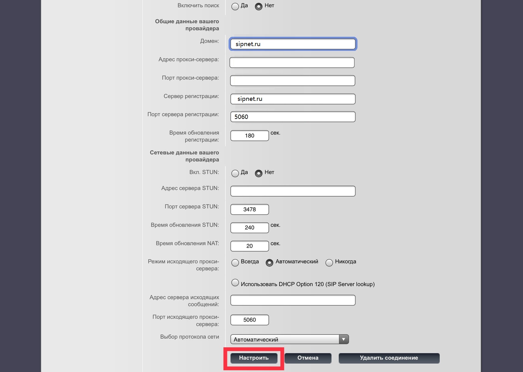 В меню Дополнительных настроек указываем SIP-сервер: sipnet.ru